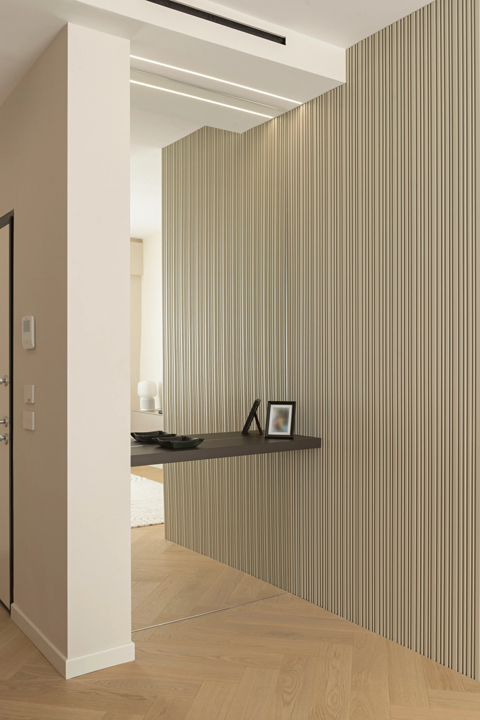 L'appartamento presentava originariamente una zona giorno frammentata e di dimensioni ridotte; la richiesta della committenza era quella di ottenere un ampio spazio open space, luminoso e funzionale. L'eliminazione delle pareti in corrispondenza dell'ingresso ha permesso di ridisegnare completamente la distribuzione, creando un grande ambiente unitario in cui le diverse funzioni convivono in modo chiaro ed equilibrato. La zona giorno, oggi completamente aperta, è invasa dalla luce naturale, amplificata dall'utilizzo di materiali e tonalità chiare e neutre che ne accentuano la percezione di luminosità e continuità. Lo spazio è organizzato in maniera fluida e ogni ambito mantiene la propria funzionalità pur all'interno di un unico ambiente condiviso, rafforzando la percezione di ordine e armonia. La riorganizzazione complessiva ha interessato anche la zona notte e i servizi: da un unico bagno ampio presente in origine è stato possibile ricavarne tre, ripensando completamente la distribuzione interna. L'abitazione ospita oggi due camere matrimoniali e una camera singola; la camera padronale è dotata di bagno en suite con finiture eleganti, mentre un bagno principale serve la zona notte. Un piccolo bagno di servizio per gli ospiti, caratterizzato da carta da parati black & white, superfici scure e un lavabo freestanding color rosso ciliegia, introduce un accento più deciso e contemporaneo all'interno del progetto. La nuova configurazione ha inoltre permesso di ricavare una piccola lavanderia, accessibile dalla zona giorno tramite una porta filo muro, integrata in modo discreto nell'organizzazione degli spazi.