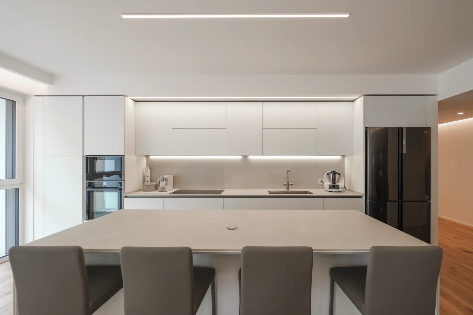 L'appartamento, nel centro di Monza, si colloca nel contesto di una nuova costruzione di prestigio. Sin dall'ingresso, attrezzato con cappottiera e cassetto svuota tasche con grande specchio, abbiamo studiato una doppia illuminazione, generale e d'atmosfera, composta da faretti e gole nascoste, che si ritrovano in vari ambienti della casa. L'ampia zona giorno, ad esempio, è circondata da una veletta in cartongesso che, nascondendo il binario delle tende, consente un'illuminazione morbida e calda di tutta la stanza, adatta alle ore serali. Circondato da una grande terrazza, l'open space è composto da una grande cucina chiara, che dona luminosità alla stanza, realizzata in vetro satinato con isola centrale e piano snack. Più avanti una boiserie cannettata in legno massello, fa da sfondo alla libreria Lago, alleggerita dai sostegni in vetro trasparente. Dall'ingresso, un sistema di porte scorrevoli in vetro separa il disimpegno, garantendo il passaggio della luce, ma nascondendo con la sua trama effetto tessuto quello che vi è dall'altra parte. Da qui si accede al primo bagno, con vasca freestanding, allo studio e alle due camere da letto. Una di queste è quella padornale, la cui caratteristica è la parete fronte letto in cui le due porte che conducono al bagno e alla cabina armadio, diventano un elemento caratterizzante. Si tratta, infatti di un gioco di pannelli, fissi e scorrevoli: un pannello fisso al centro definito da un'applique, nasconde due led verticali ai lati che illuminano lo spazio tra esso e le due porte quando sono chiuse. Quando le due porte scorrevoli vengono aperte, invece, vanno ad occupare quello spazio creando un blocco unico.