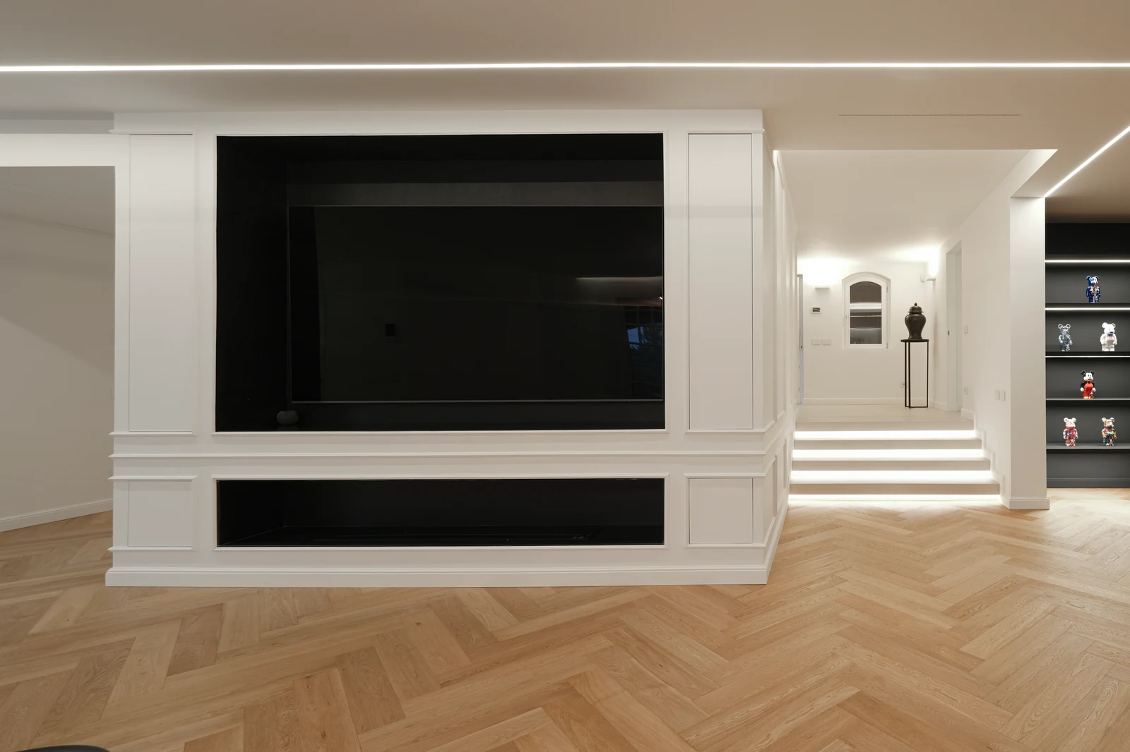 Questa grande villa su tre piani immersa nel parco dei colli di Bergamo, è stata oggetto di una ristrutturazione completa, con una nuova distribuzione degli spazi interni mirata a creare una grande zona giorno al piano di accesso, una zona notte al piano superiore e uno spazio ludico ricreativo al piano inferiore. Lo stile mixa elementi minimal, come il bianco ottico, il nero/blu scuro e le porte filomuro, con elementi classici, come il parquet a spina, le cornici a parete e i battiscopa decorati e rimane il filo conduttore di tutta la casa. L'ingresso collocato su una quota superiore rispetto al resto della zona giorno, è contraddistinto dall'uso di una pavimentazione in gres grande formato che prosegue sulle scale che conducono al piano superiore oltre che sui gradini che conducono al living, illuminati da un led nascosto. Già da qui si sviluppa il blocco centrale della casa che, circondando le scale, è arricchito da cornici boiserie che nascono diverse funzioni. All'ingresso nascondono due porte (una di accesso al piano superiore e una per una zona guardaroba), dal living fino alla zona pranzo iniziano ad avere una funzione contenitiva nascondendo delle ante su misura in cartongesso pur mantenendo la resa finale di una parete chiusa. Frontalmente ai divani inglobano anche due nicchie scure che contengono la grande tv e il camino a bioetanolo; una terza la troviamo nella sala pranzo e racchiude una lampada decorativa di Catellani & Smith, facendo da fondo ad un grande tavolo in marmo. Il passaggio tra living e zona pranzo è stato realizzato grazie ad un intervento strutturale che ha permesso la rimozione di un pilastro, attraverso la realizzazione di un'apposita cerchiatura. Tra sala da pranzo e cucina, invece, un filtro è composto da un ampio sistema vetrato di Rimadesio che consente di aprire e chiudere le due porte centrali lasciando la cucina sempre a vista. Al piano superiore si giunge attraverso la scala la cui particolare forma a ventaglio e l'illuminazione ricavata sotto ad ogni gradino creano un effetto scenico. Qui si è accolti da un corridoio blu notte, sulle cui pareti troviamo nuovamente le boiserie a nascondere le porte filo muro del bagno, studio e delle 3 camere. La prima è la suite matrimoniale, composta da una grande cabina armadio, una zona home office e la zona letto: proprio nel mezzo troviamo, infatti, un grande mobile realizzato su misura da nostro progetto che, grazie ad un meccanismo interno, permette di nascondere al suo interno la tv, facendola fuori uscire solo durante l'utilizzo. Sul retro troviamo poi una comoda scrivania. Il bagno en suite è anticipato da una grande vetrata fissa (che richiama quella della cucina) che ingloba la zona lavabo, composta da un mobile interamente realizzato in gres e integrato con la parete retrostante dello stesso materiale. Una porta separata, invece, la zona più privata contenente una vasca freestanding sul cui retro si trova una parete con nicchia su entrambi i lati: dall'altra parte troviamo, infatti, una grande doccia filo pavimento con seduta. Al piano più basso troviamo l'ambiente ludico della casa, composto da una zona cinema con proiettore, un tavolo da biliardo trasformabile in tavolo da ping pong e una zona bar e cocktail con tavolo per il poker.