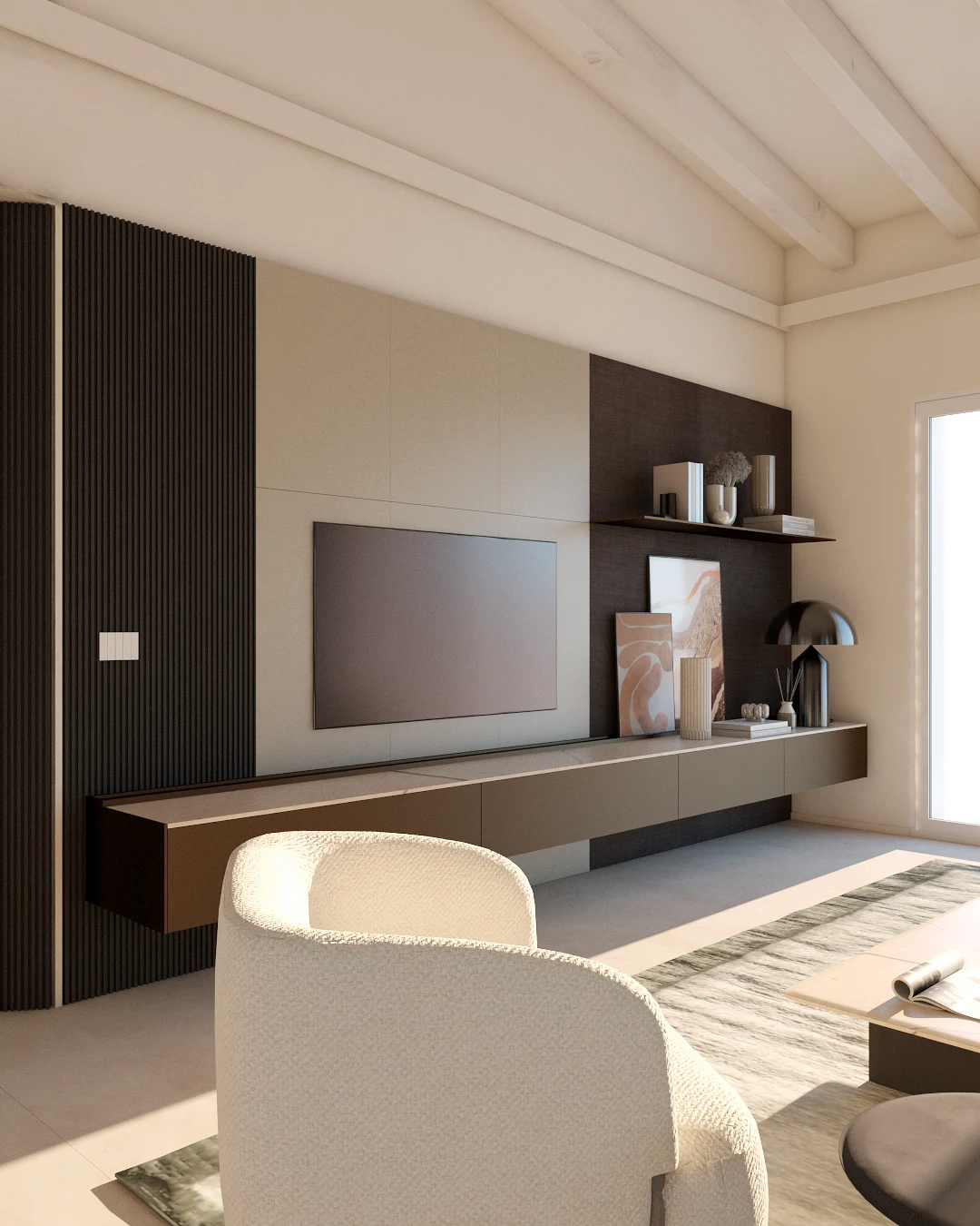 Gli spazi della grande zona giorno di questa residenza sono ben proporzionati con quelli dall'altrettanto ampia suite padronale. Mobili custom, abbinamenti materici e uno studio di dettaglio volto a valorizzare al massimo l'architettura dell'immobile. Le altezze importanti accolgono la dinamicità dell'approccio progettuale che alterna elementi contenitivi e funzionali, a scelte di design che strizzano l'occhio all'estetica. La grande suite padronale è il fiore all'occhiello di questo progetto con ampia zona armadio a tutta altezza che sfrutta al massimo lo spazio, area letto e bagno a cui si accede nella parte posteriore con doccia walkin visibile anche dalla cabina armadio.